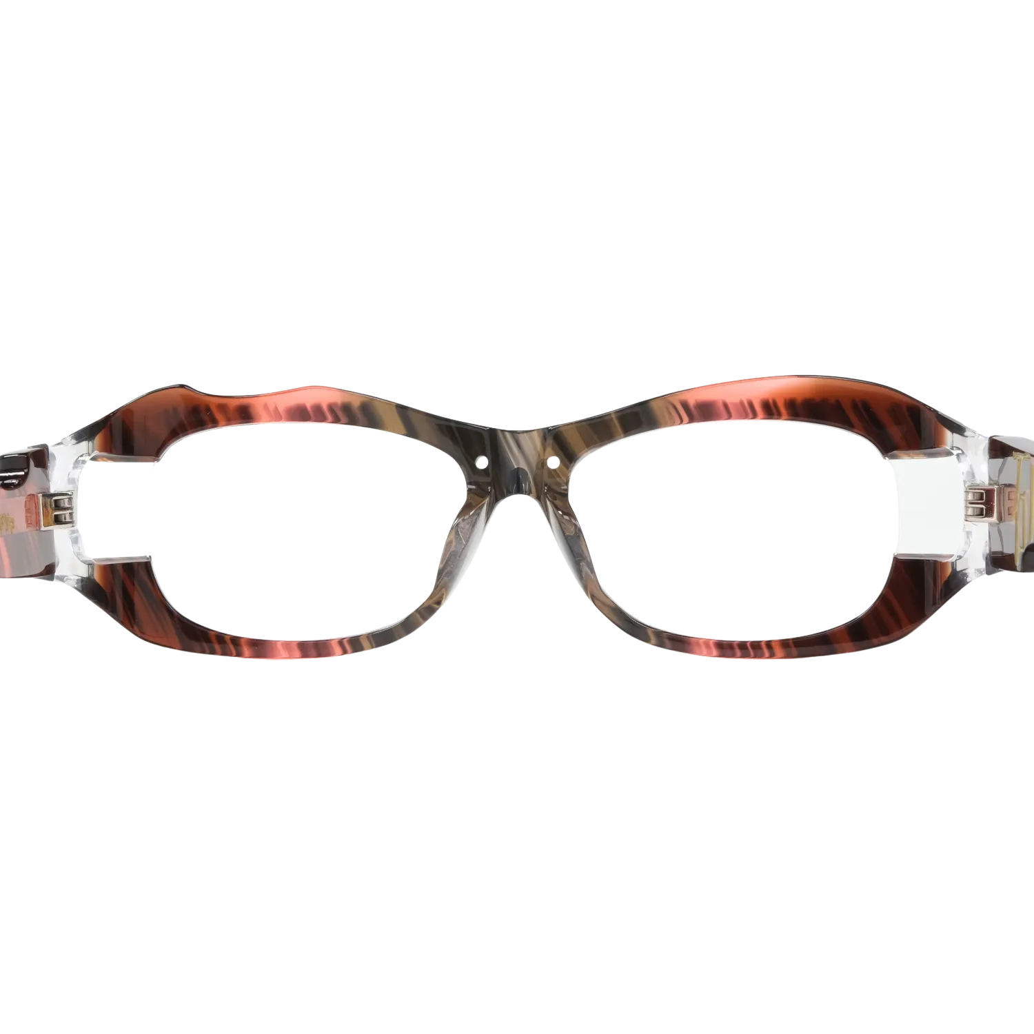 「破」の最も革新的な特徴は、意図的な「LACK」(欠如)をデザインの核心に据えたことです。左フロント上部の大胆な欠損、ブリッジに開けられた2つの貫通ホール。通常のアイウェア設計では忌避される「欠け」や「穴」を、あえて積極的にデザイン要素として採用しています。