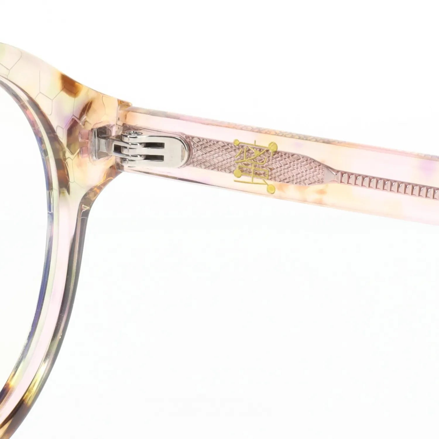 「蜜」の最大の特徴は、パーツとしてラメを使用した革新的なデザインです。従来のフレーム全体がキラキラしているラメ入りアセテート生地とは異なり、今回はパーツとして効果的にラメを配置することで、蜂蜜のような美しい輝きを表現しています。