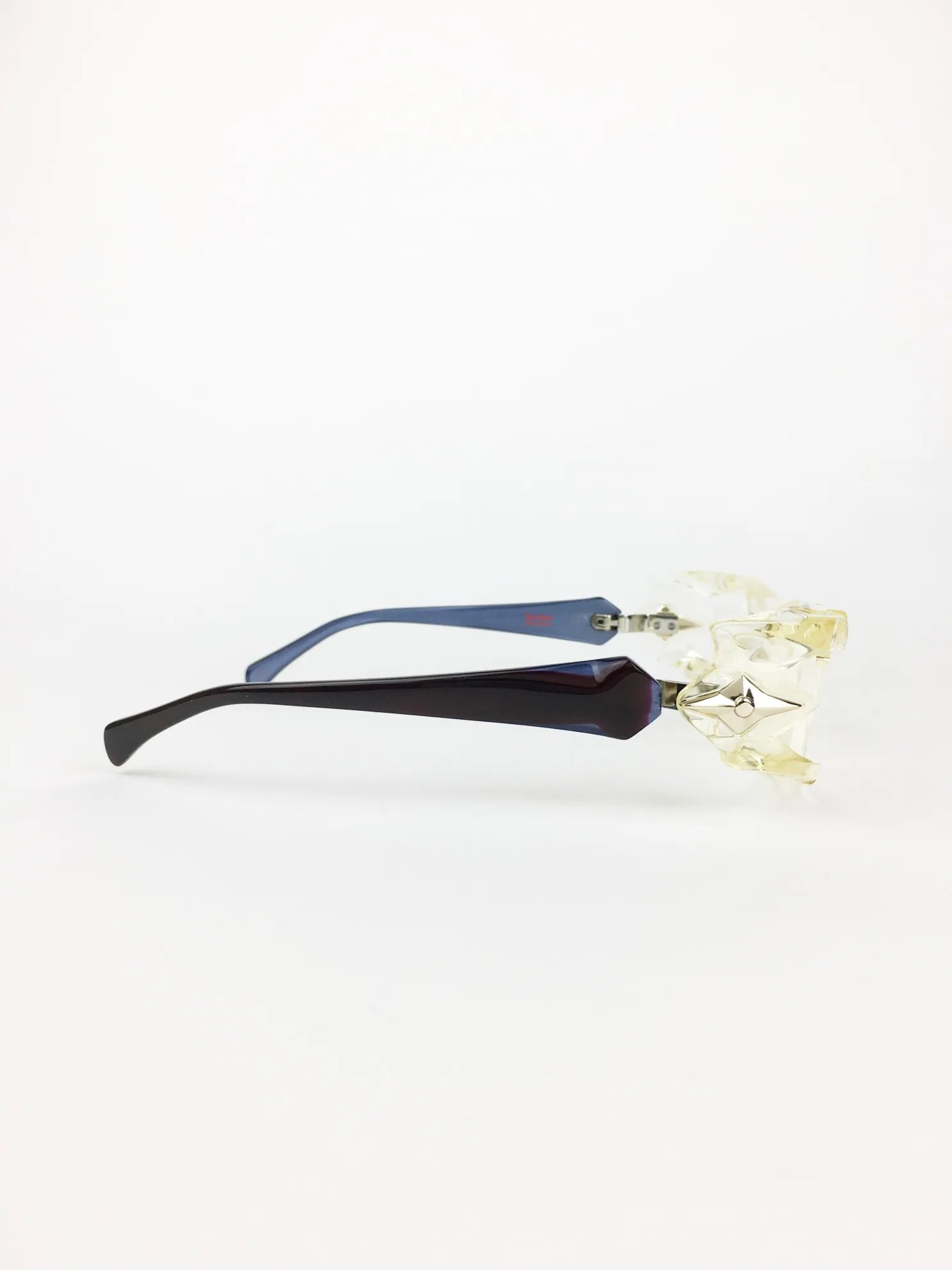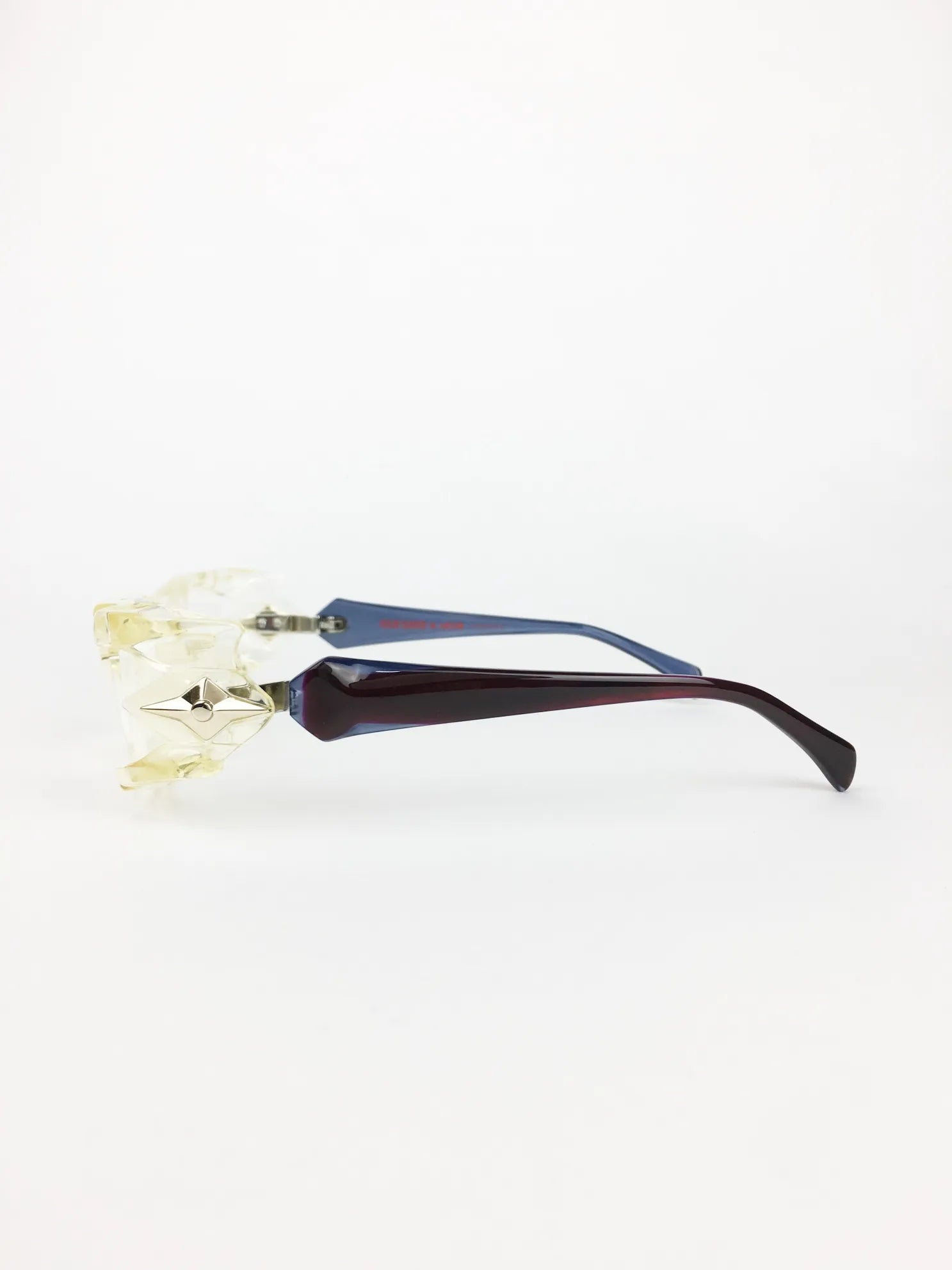極限まで大きなレンズサイズと、フロントエンドの鋭角的なエッジラインが絶対的なアクセントとなっています。この大胆なデザインは、ニンジャスレイヤーの世界における激しい戦闘シーンを彷彿とさせます。鋭角的なラインは、まるで刃物のような鋭さを持ち、見る者に強烈なインパクトを与えます。