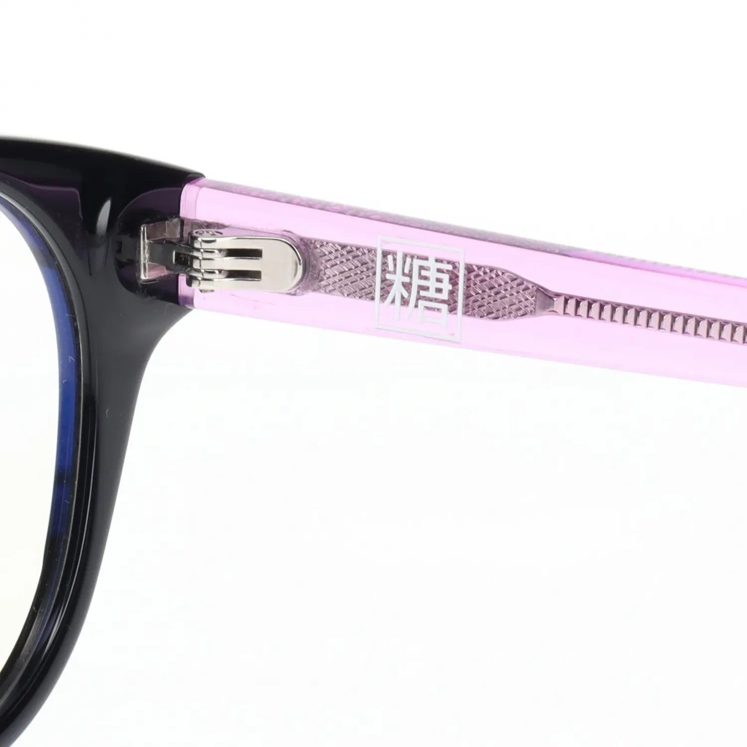 「糖」の最大の特徴は、パーツとしてラメを使用した革新的なデザインです。これまでの一般的なラメ入りアセテート生地とは全く異なるアプローチで、フレームの特定の部分に効果的にラメを配置することで、角砂糖のような美しい輝きを表現しています。