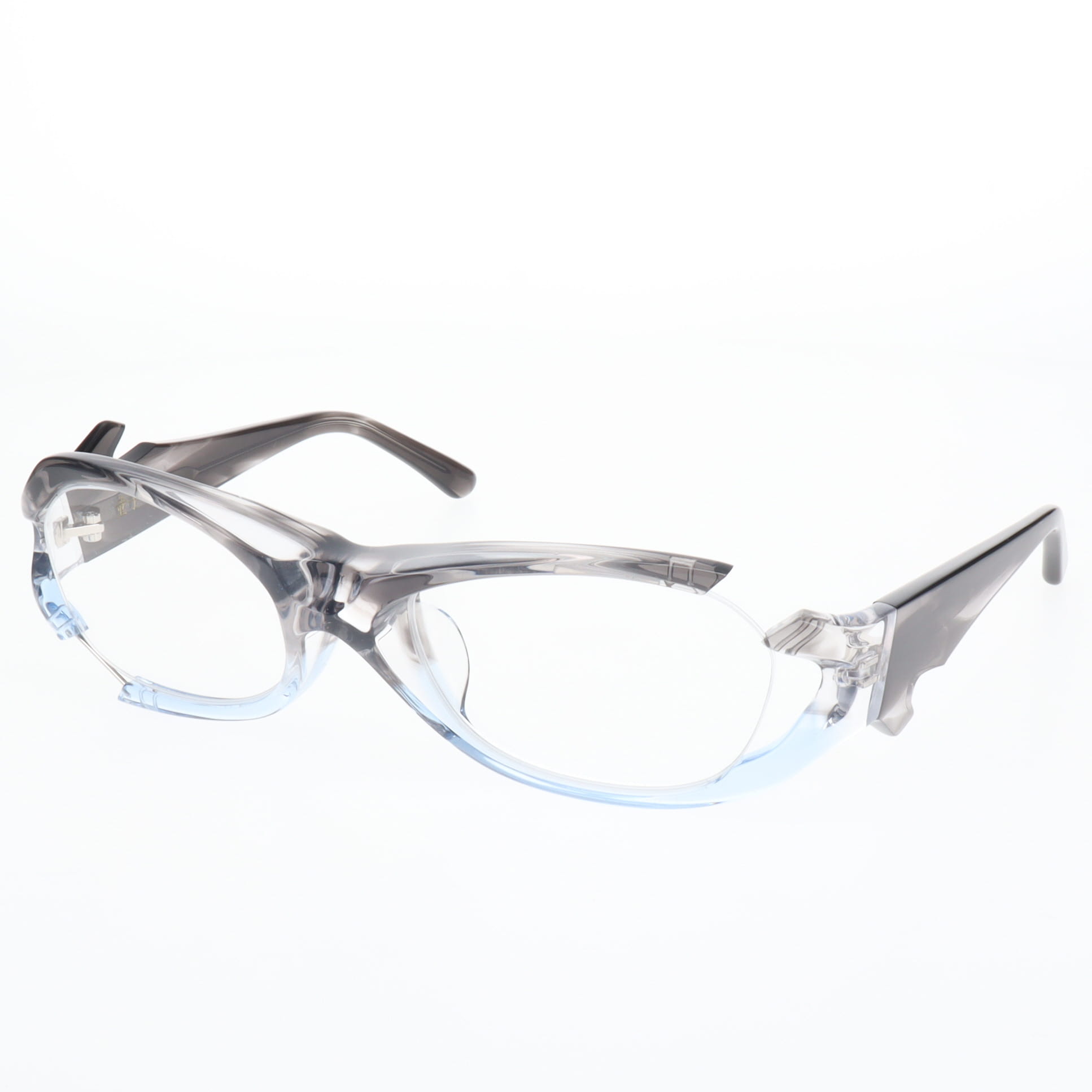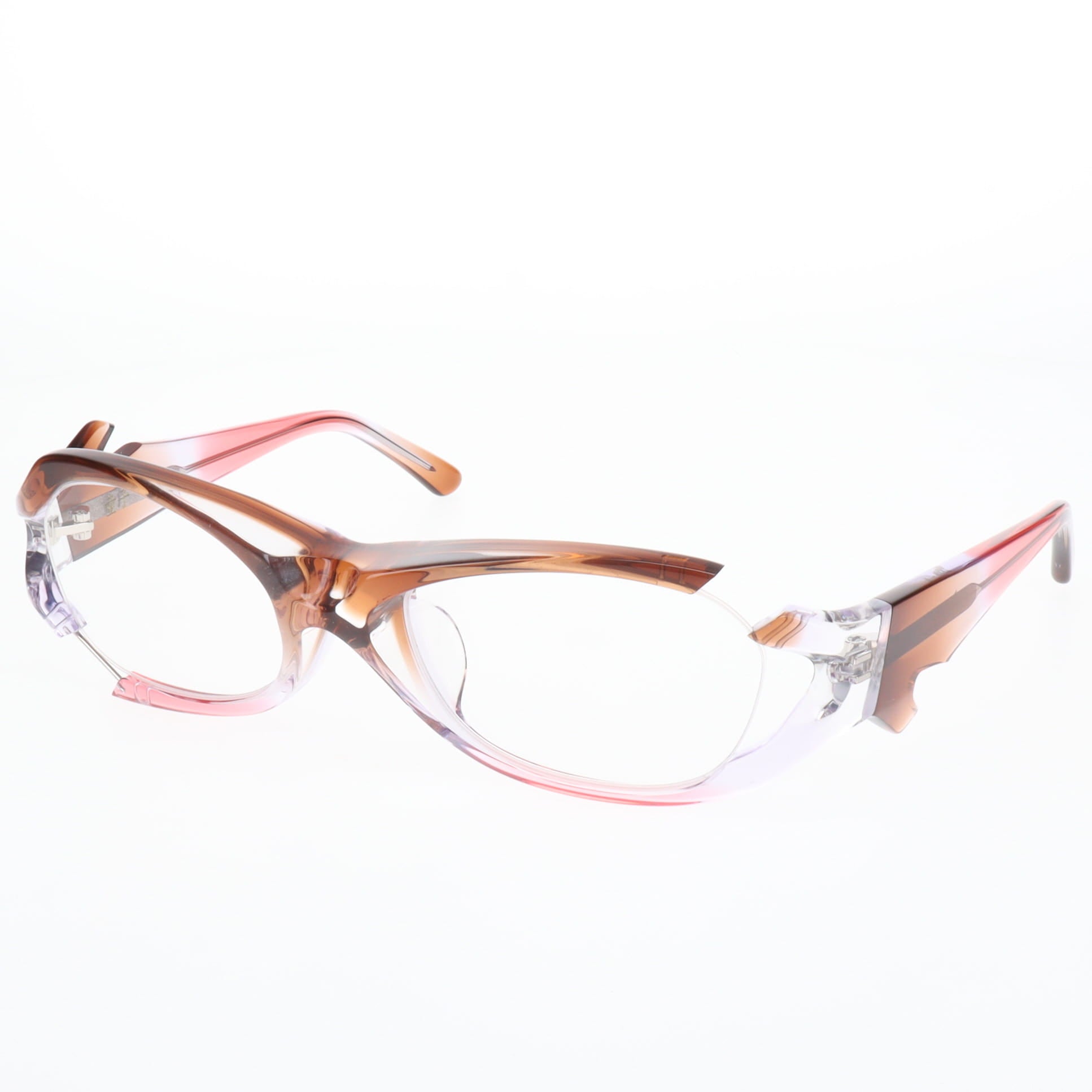 フロント部分はクリア、テンプル部分がブラウングラデーションの軽やかなカラー。クリアフレームの透明感が、顔の印象を明るく優しく見せてくれます。