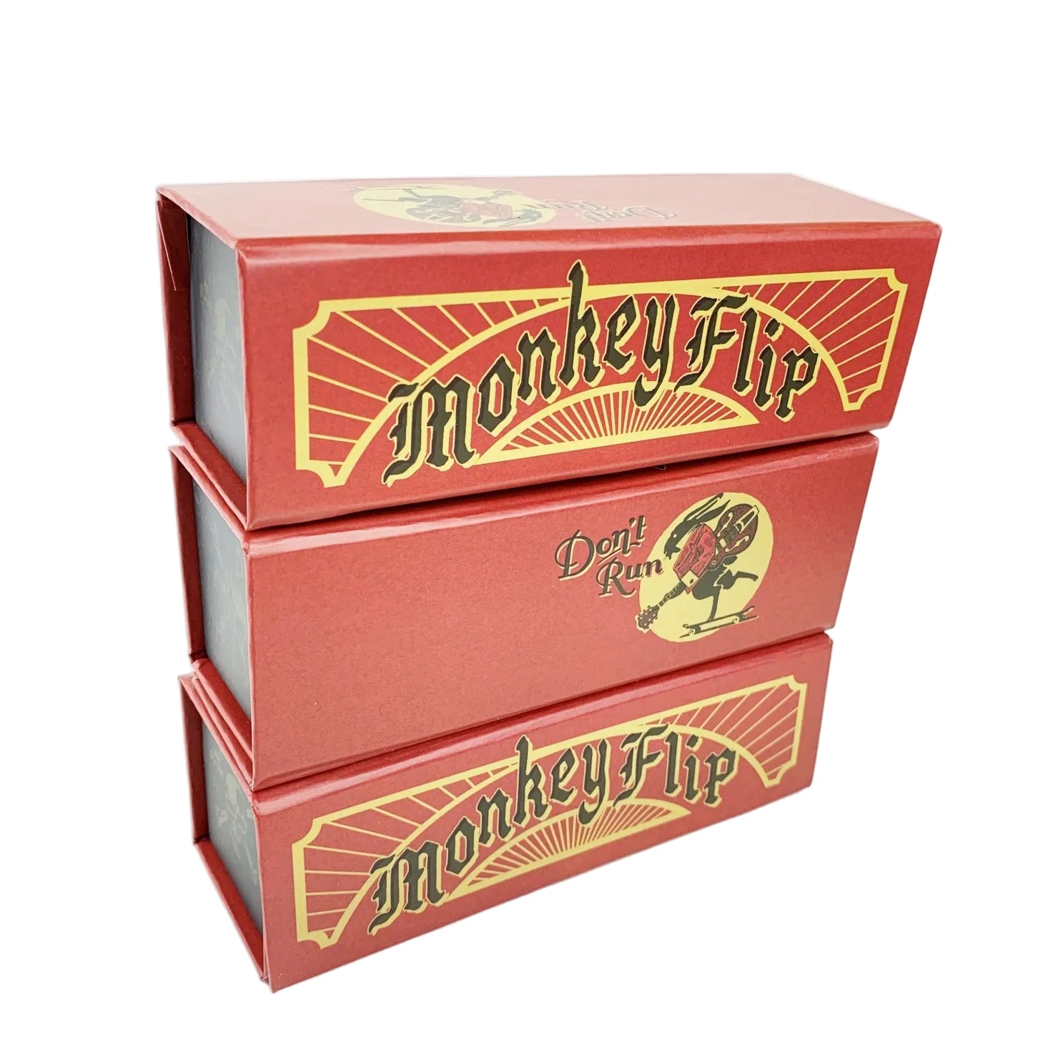 ケースを広げた瞬間に現れるのは、スケートボードに乗るうさぎや、不敵に笑うスカル。 クラシックな外面からは想像もつかないストリートの遊び心が、漆黒のライニングに刻まれています。この「二面性」こそが、MonkeyFlipが貫くリアル・ストリートの証。