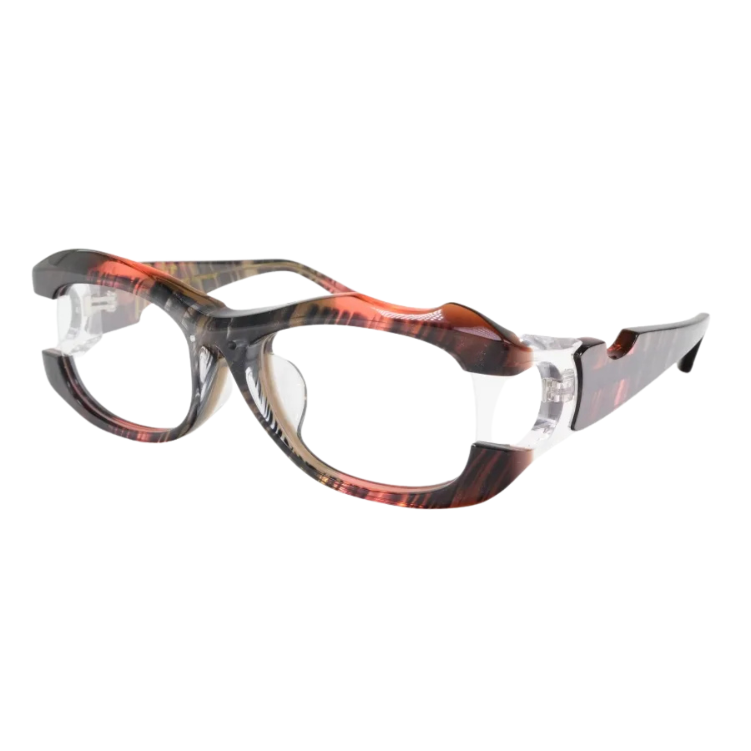このボリューム感と意図的な欠損の組み合わせは、従来のアイウェアデザインでは見られない独特な存在感を生み出しています。重厚でありながら軽快、攻撃的でありながら洗練されている。この相反する要素の絶妙なバランスこそ、MonkeyFlipだからこそ実現できた技術の結晶です。