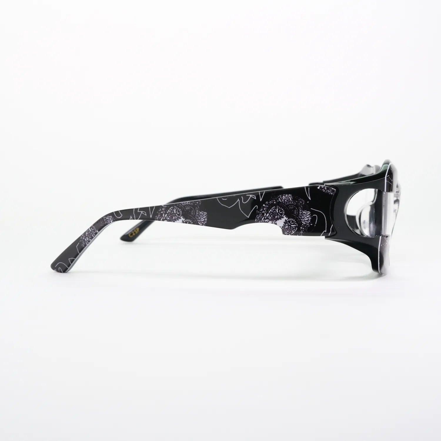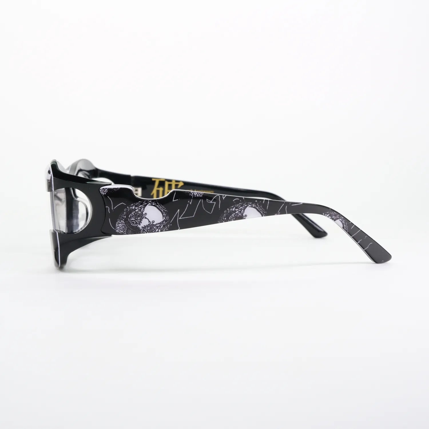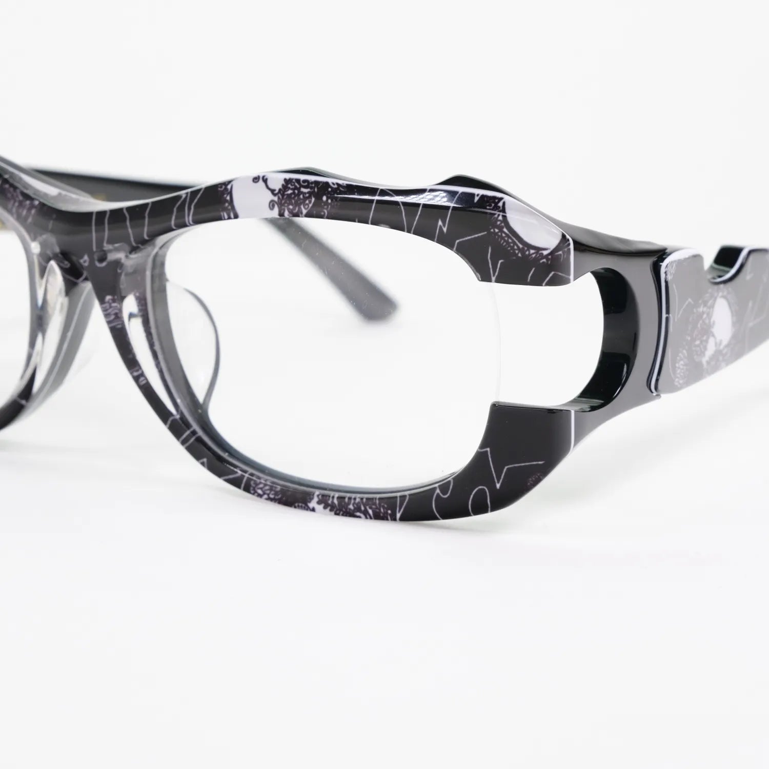 MonkeyFlipの持つアンダーグラウンドカルチャーの精神が、このオリジナルプリントに凝縮されています。ロックやタトゥーカルチャーから影響を受けた独特のグラフィックは、グリーンレンズと相まって、攻撃的でありながら洗練された印象を与えます。