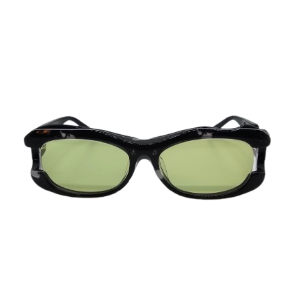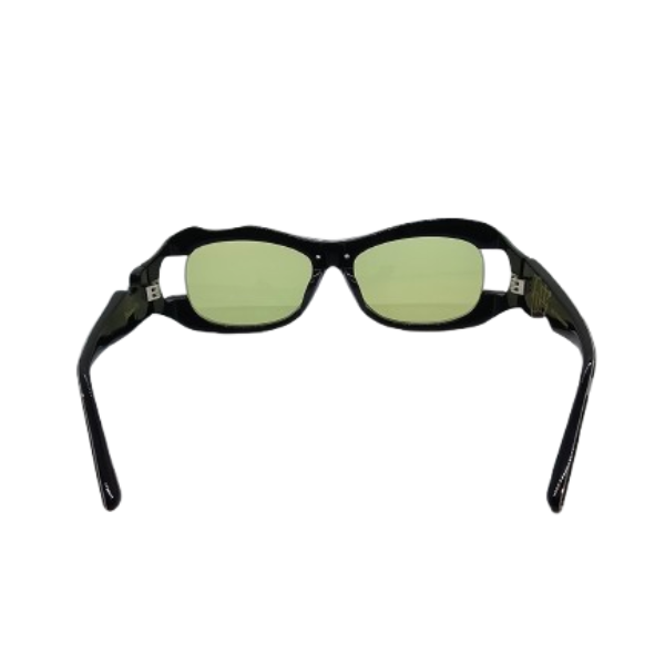 グリーンカラーのレンズが、その美しい『欠如』をより引き立てます。この鮮やかなグリーンは、単なるカラーリングではありません。左フロント上部の欠損やブリッジの2つの貫通ホールといった意図的な欠如部分を通して差し込む光が、グリーンレンズを通過することで独特の光の演出を生み出します。