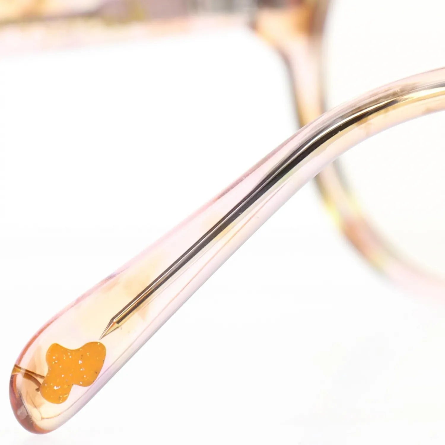 「蜜」の最大の特徴は、パーツとしてラメを使用した革新的なデザインです。従来のフレーム全体がキラキラしているラメ入りアセテート生地とは異なり、今回はパーツとして効果的にラメを配置することで、蜂蜜のような美しい輝きを表現しています。