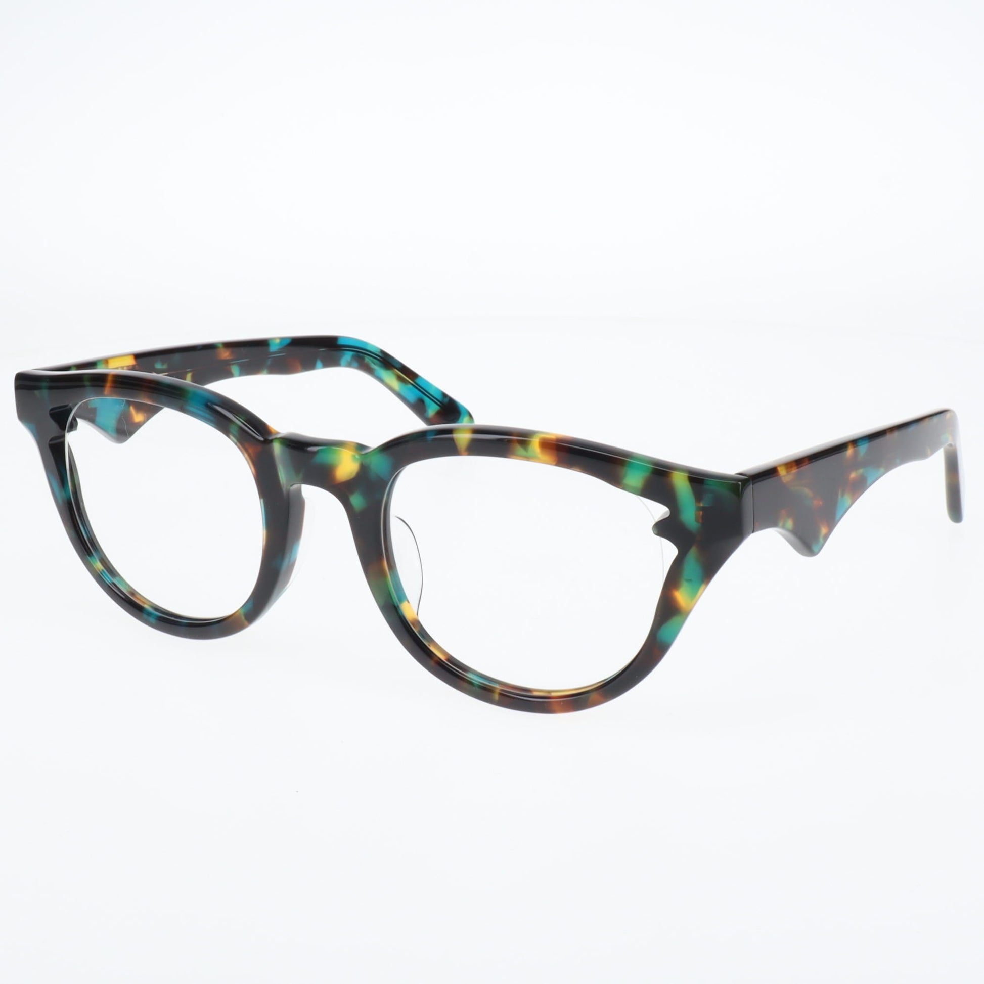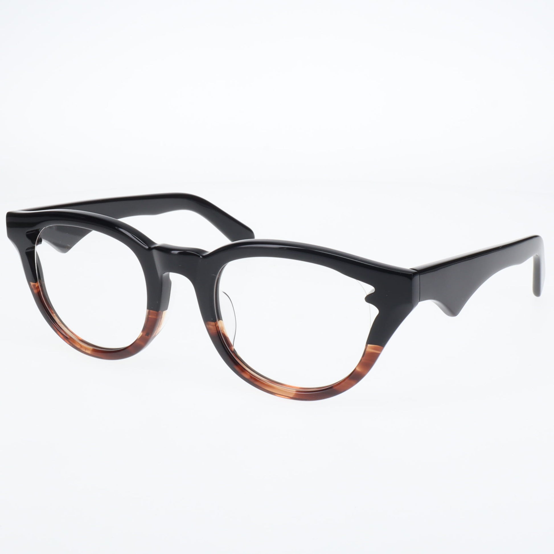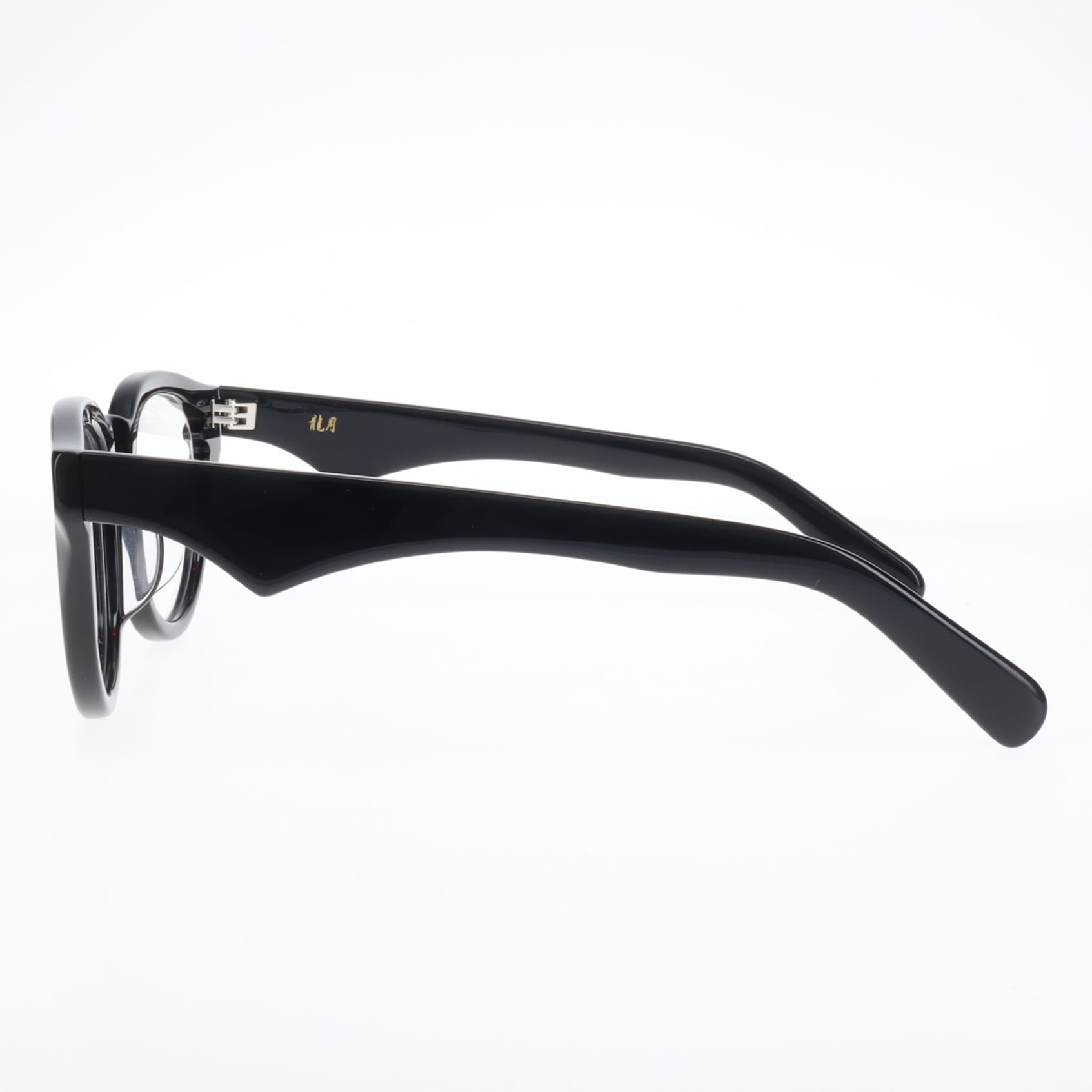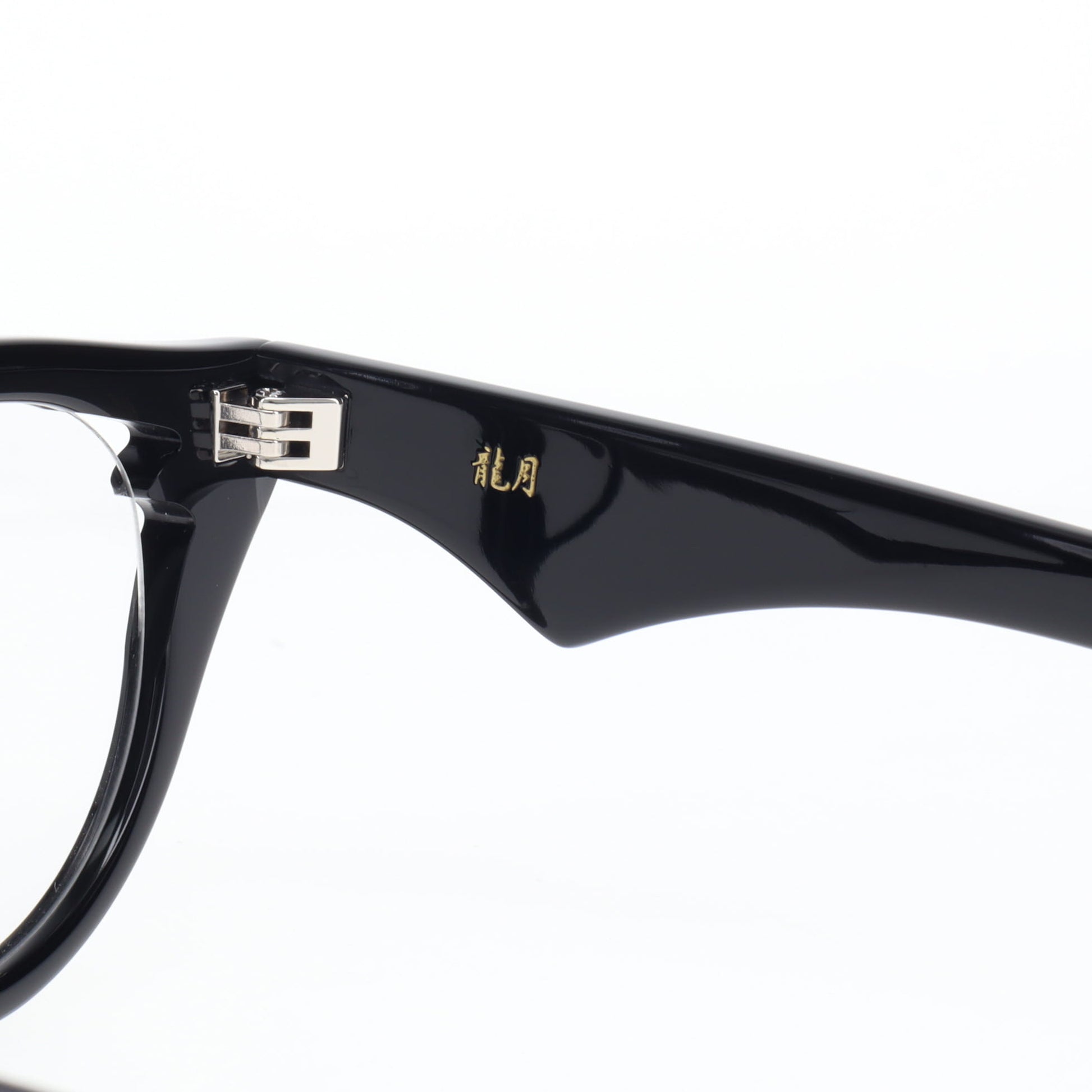 特に注目していただきたいのは、こめかみ部分でレンズをホールドする箇所に施された繊細なエッジです。この部分はフレームの機能上最も重要な箇所の一つですが、まさにここにブランドらしいギミックを加えることで、カブトムシのツノのように機能性と美しさを見事に両立させています。単なる装飾ではなく、構造上必要な部分だからこそ、そこに美しさを宿らせる―これが「龍月」のデザイン哲学です。