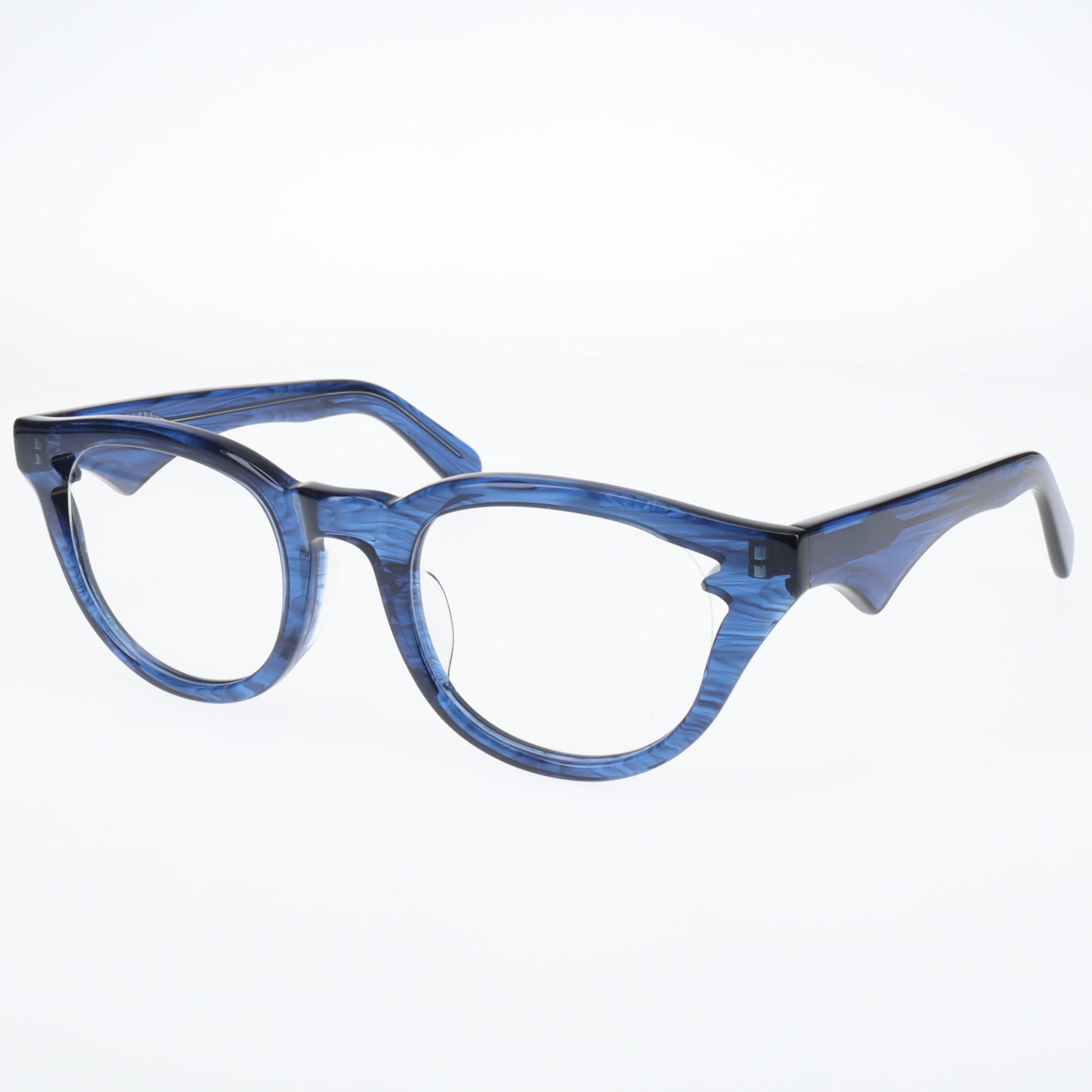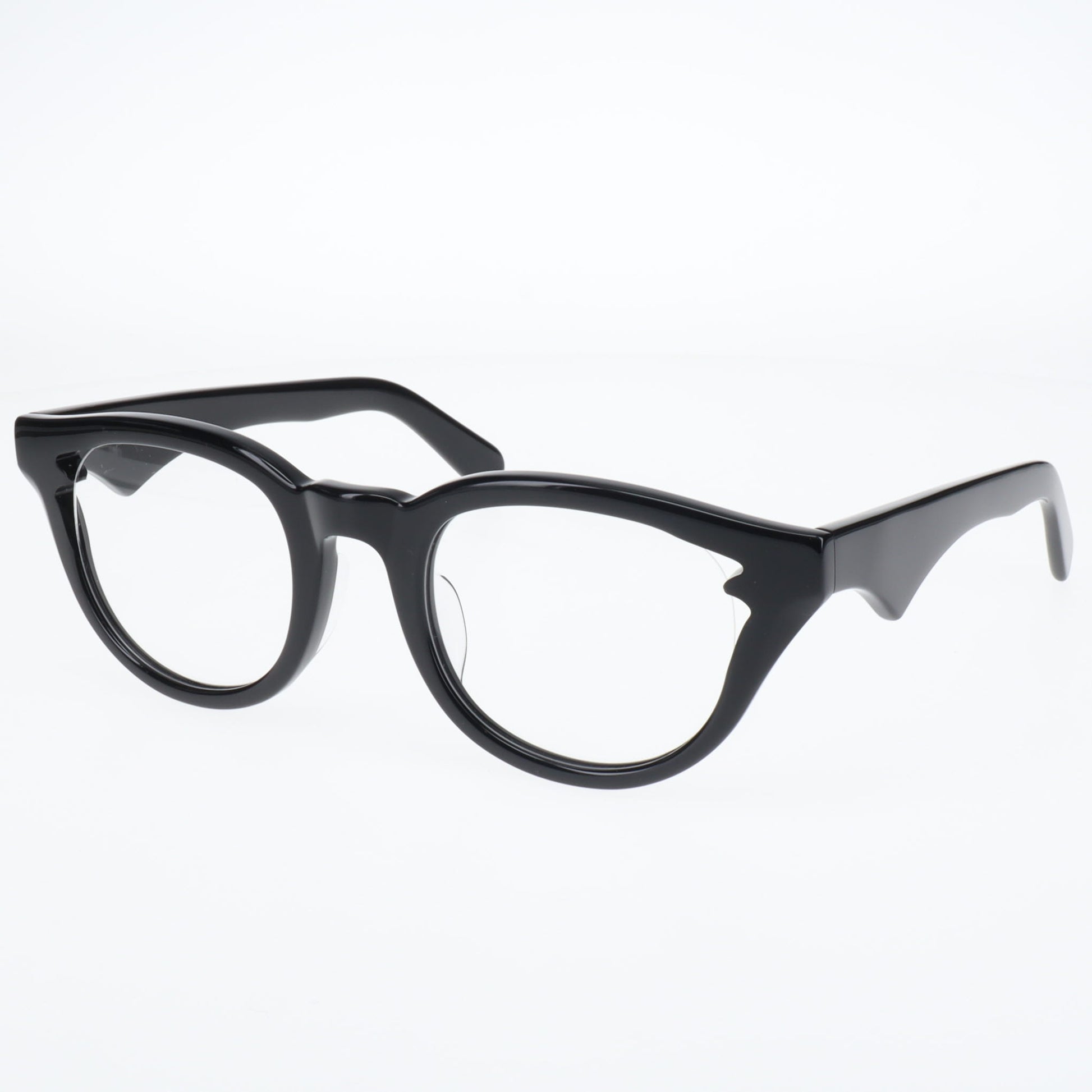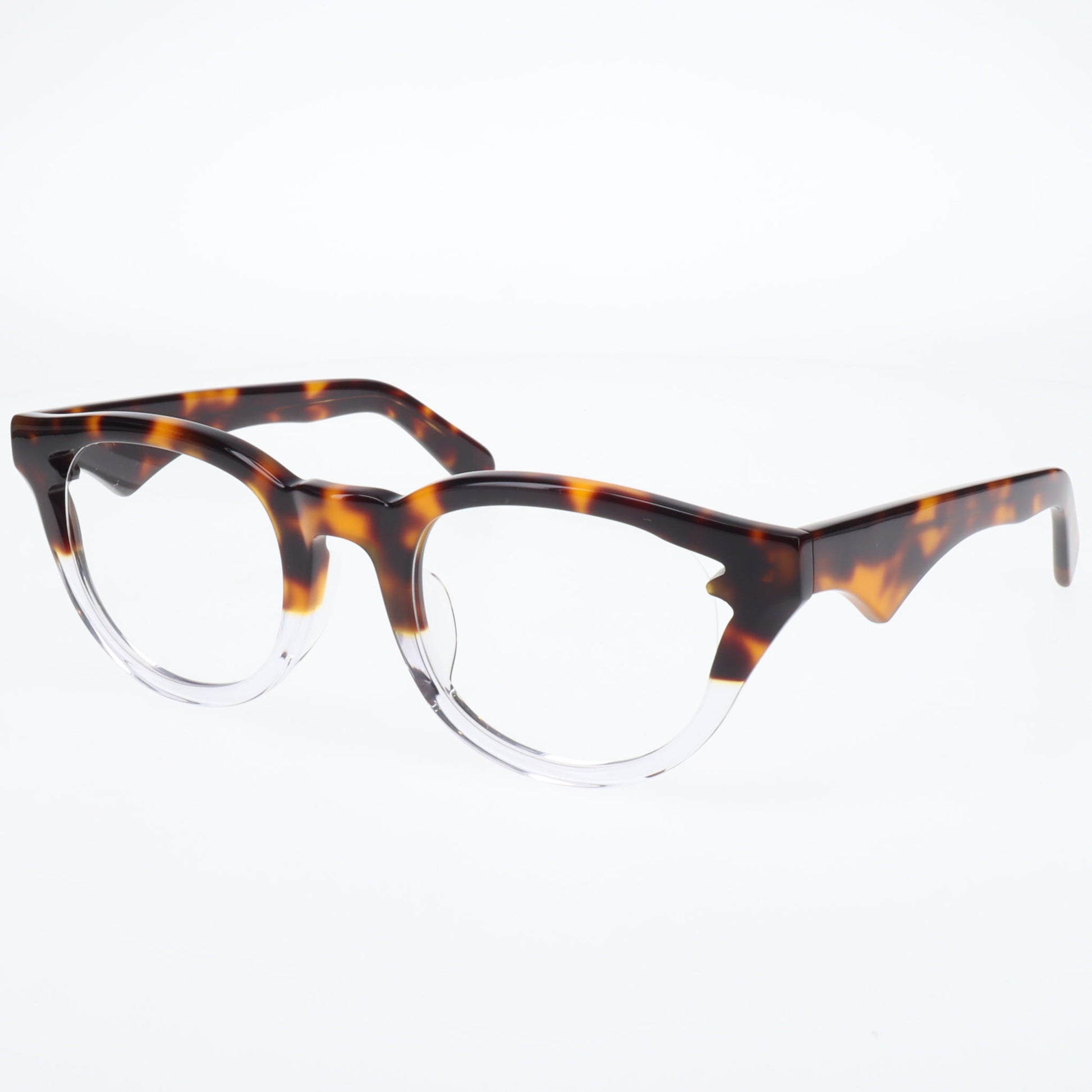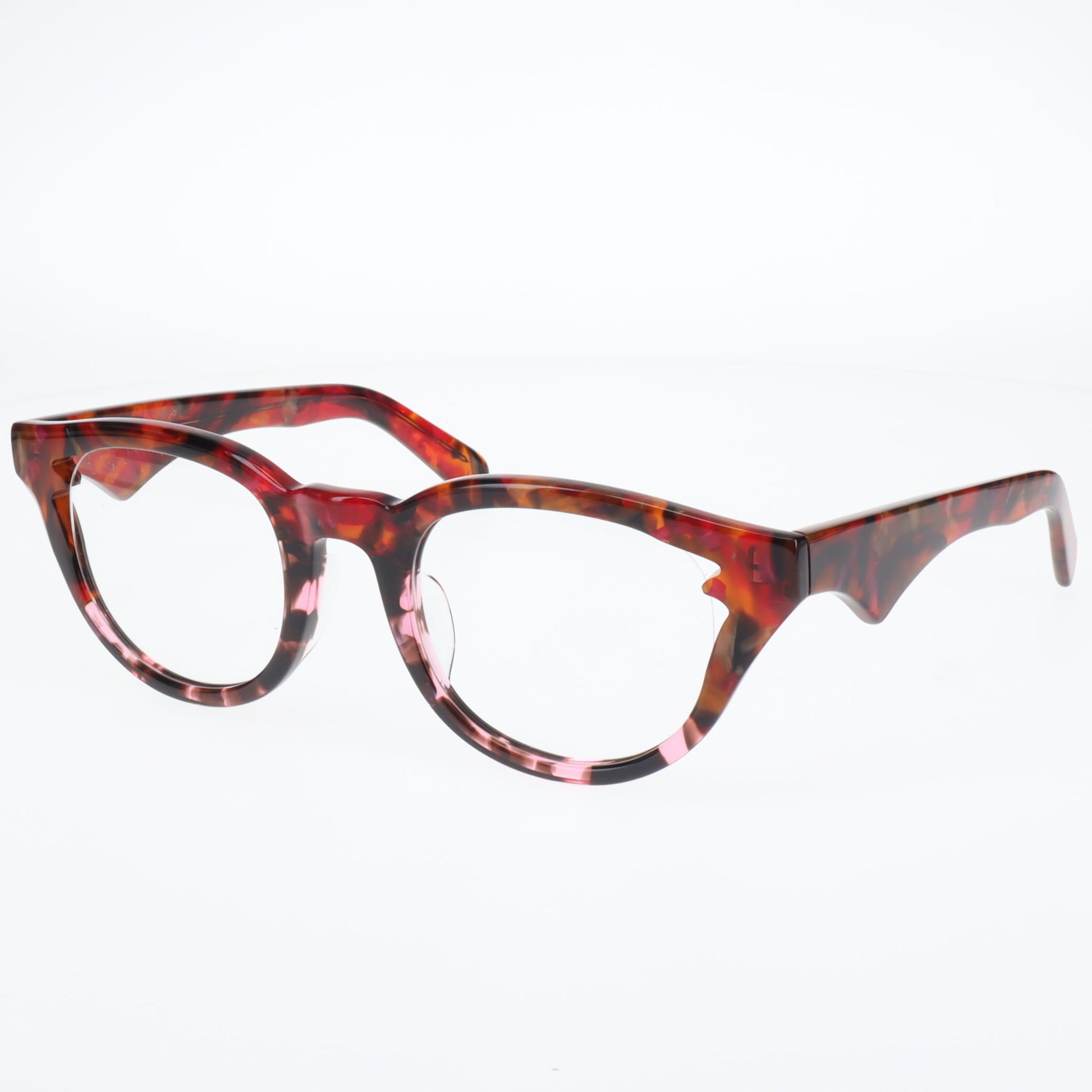 特に注目していただきたいのは、こめかみ部分でレンズをホールドする箇所に施された繊細なエッジです。この部分はフレームの機能上最も重要な箇所の一つですが、まさにここにブランドらしいギミックを加えることで、カブトムシのツノのように機能性と美しさを見事に両立させています。単なる装飾ではなく、構造上必要な部分だからこそ、そこに美しさを宿らせる―これが「龍月」のデザイン哲学です。