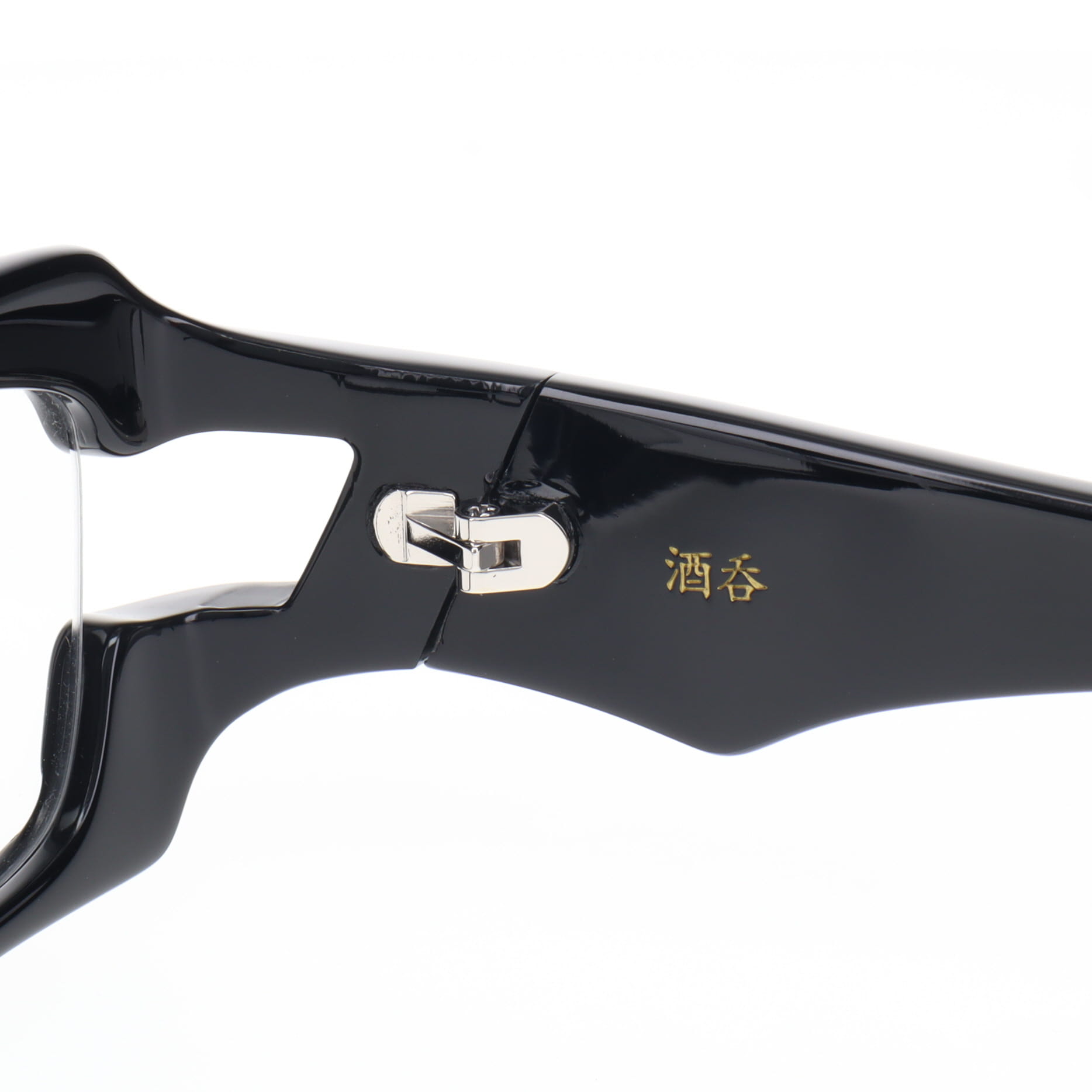 テンプルの斜め(スラント)カット。畳んだ時に角のように鋭く立ち上がるこの意匠は、酒吞童子(鬼)をモチーフにした攻撃的な象徴です。
