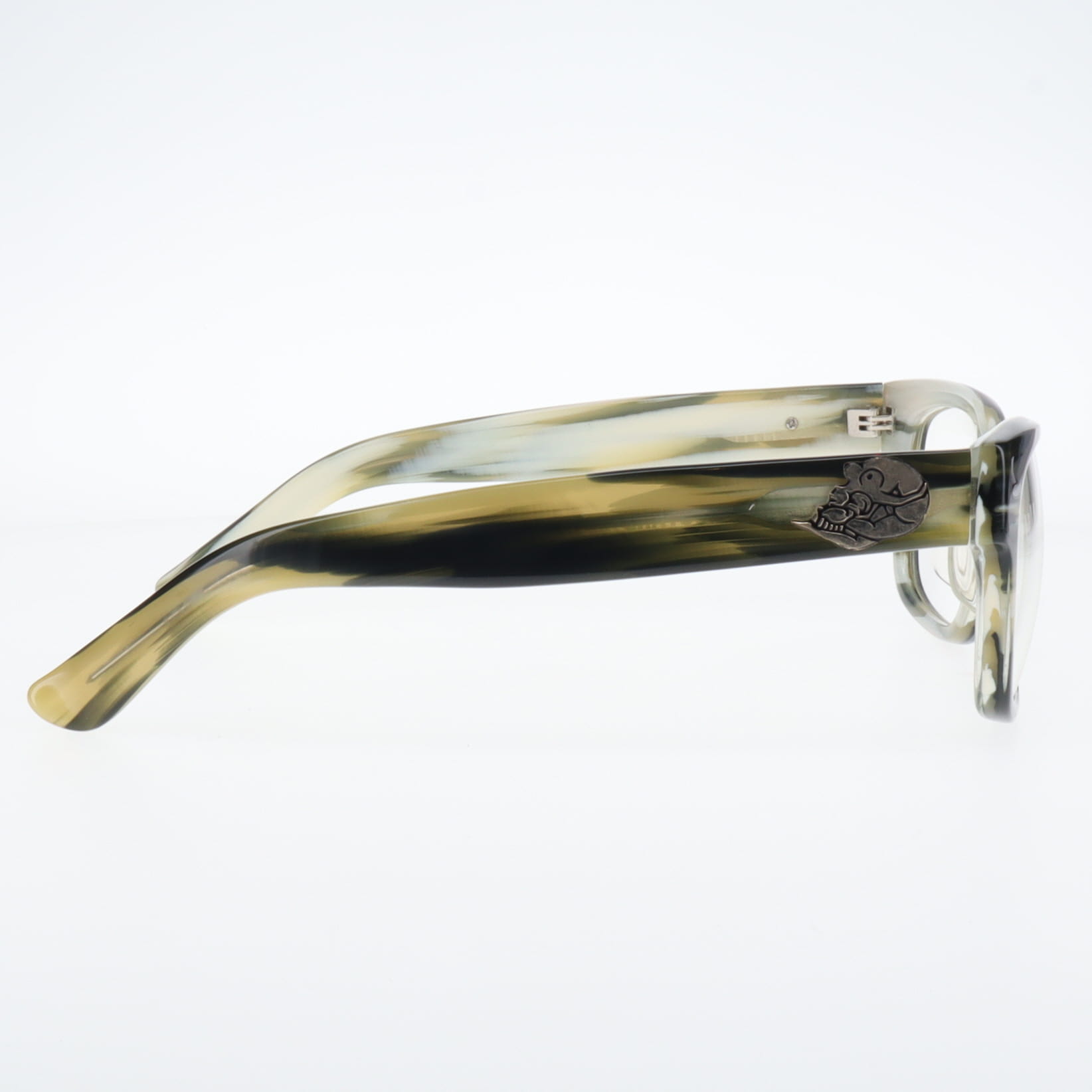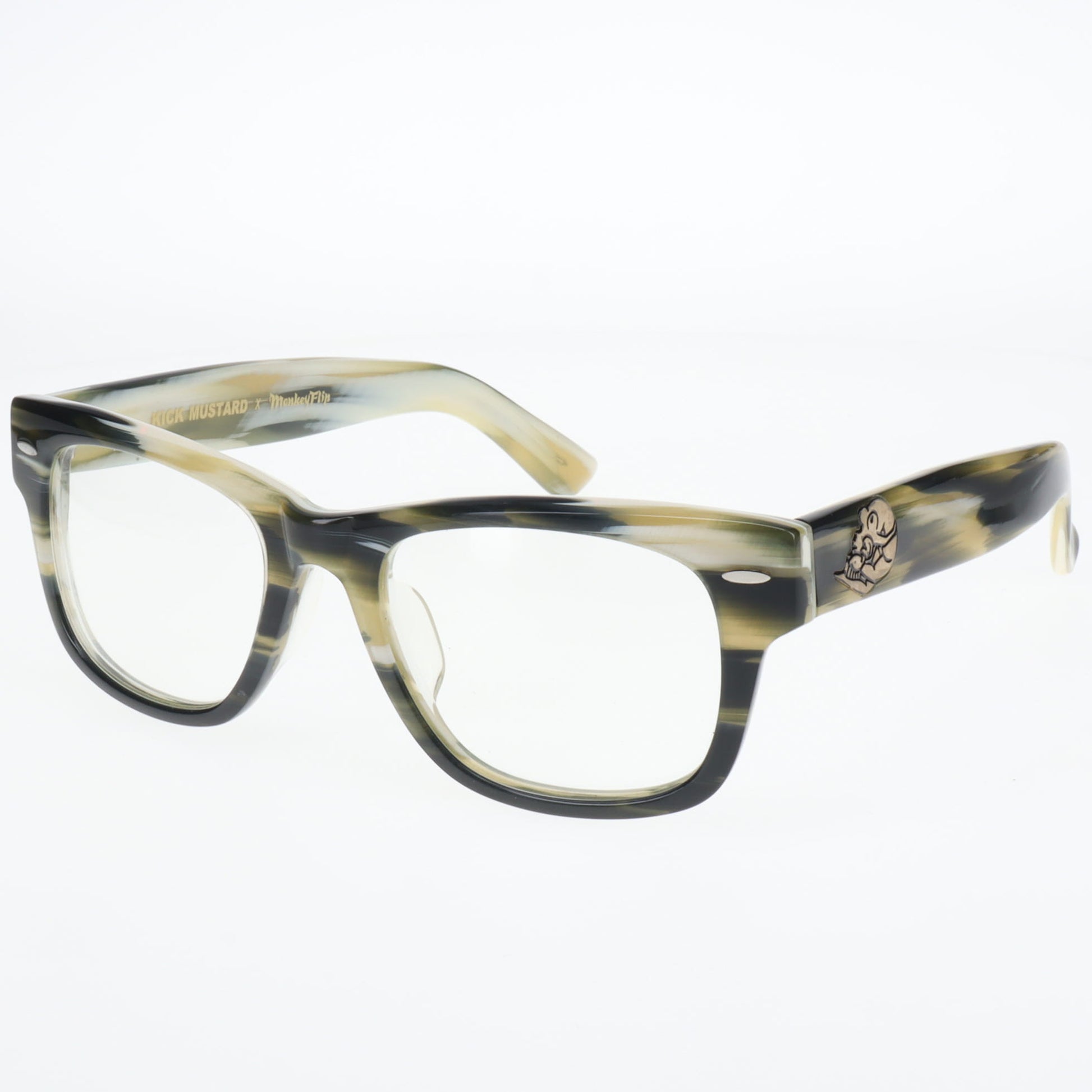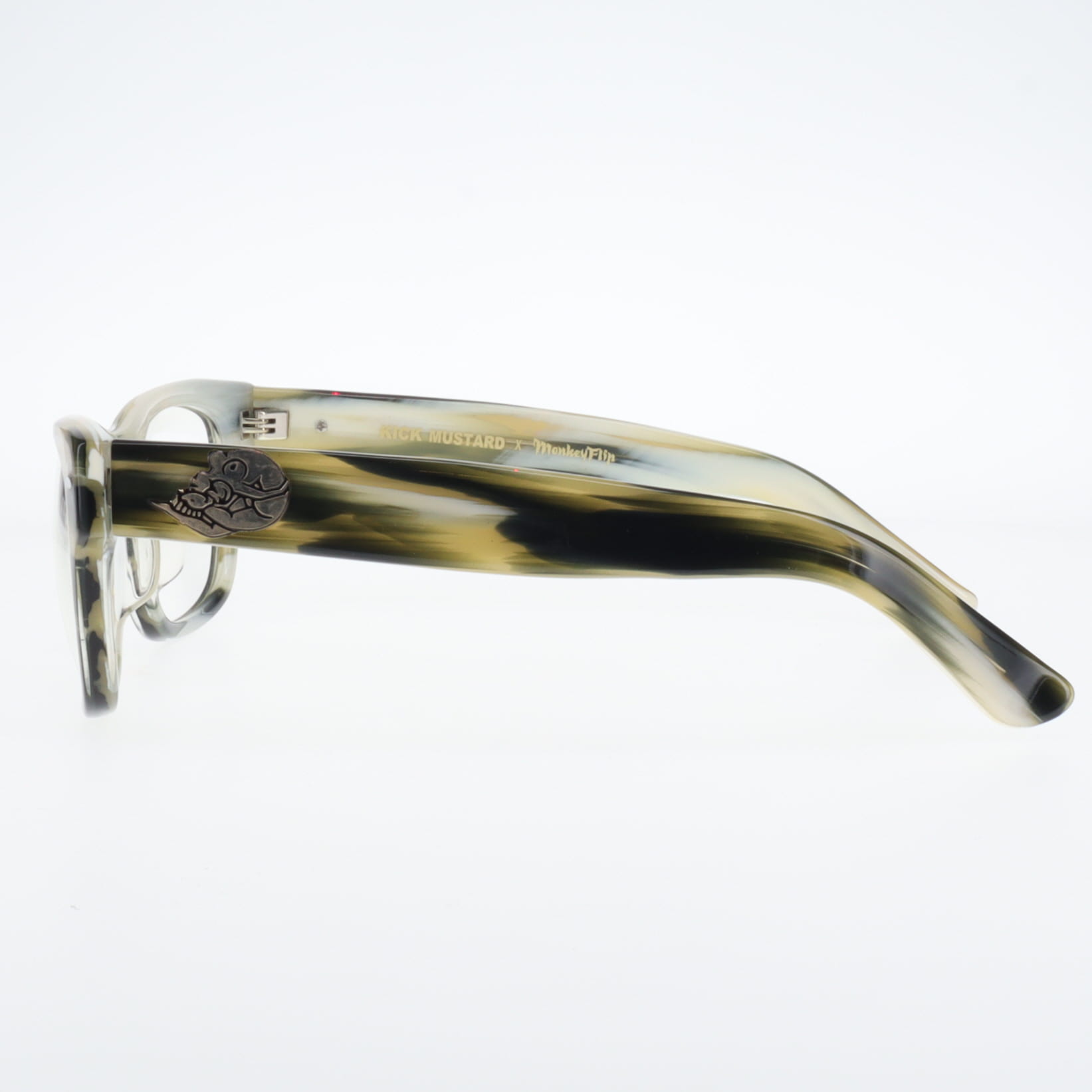 這款太陽眼鏡是 MonkeyFlip 與名古屋服裝品牌 KICK MUSTARD 聯名推出的,KICK MUSTARD 也邀請了國際知名的刺青藝術家 Horigin 參與設計。太陽眼鏡以經典造型為基礎,大膽地融入了帶有視覺錯覺骷髏頭的金屬部件。內襯則採用了醒目的豹紋迷彩圖案,展現了品牌獨具匠心的風格,遊走於地下與主流之間。