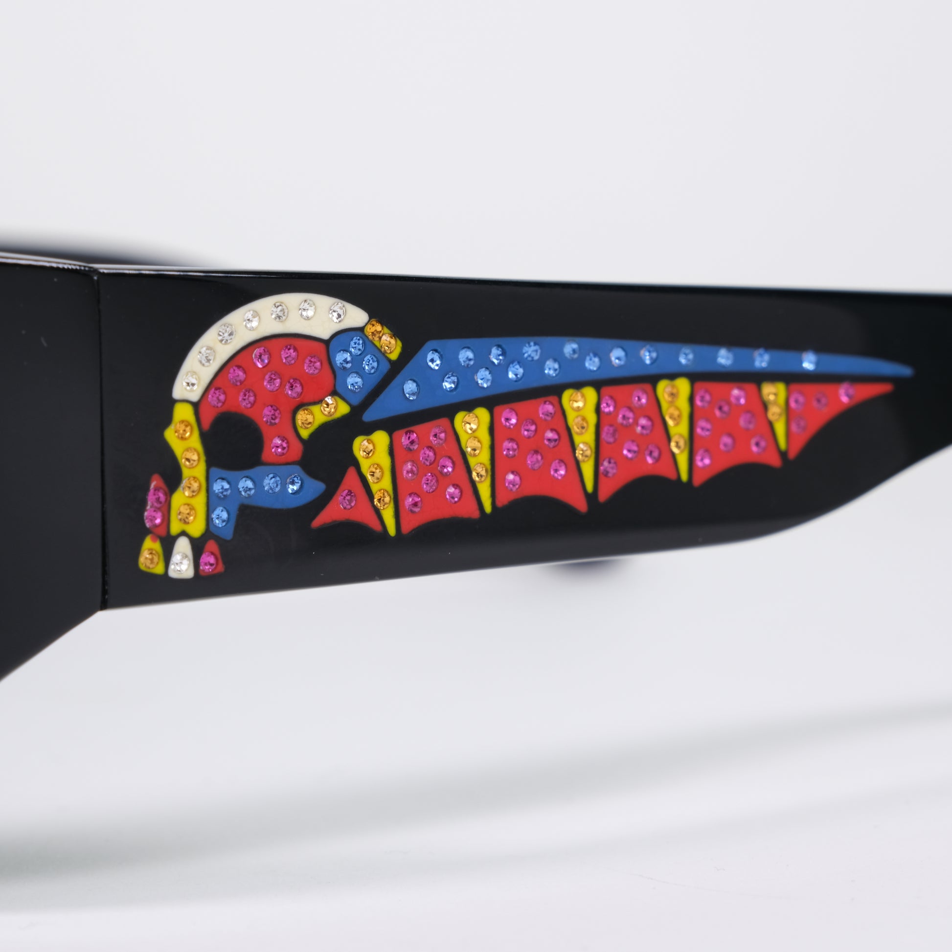 左側是一個色彩繽紛的骷髏頭和翅膀,上面鑲嵌著大量水鑽。